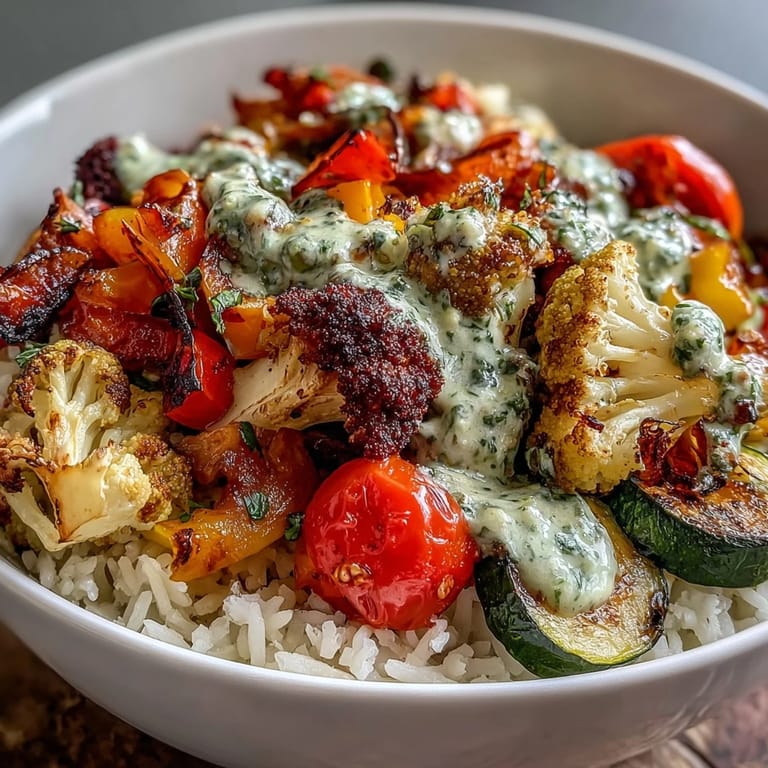 Pin It Experience a burst of color and nutrition with this Rainbow Roasted Vegetable Bowl. This dish combines a medley of oven-roasted vegetables with fluffy brown rice, all tied together by a zesty, fresh herb sauce. It is a perfect choice for anyone seeking a vibrant, wholesome, and plant-based meal that is as pleasing to the eye as it is to the palate.
